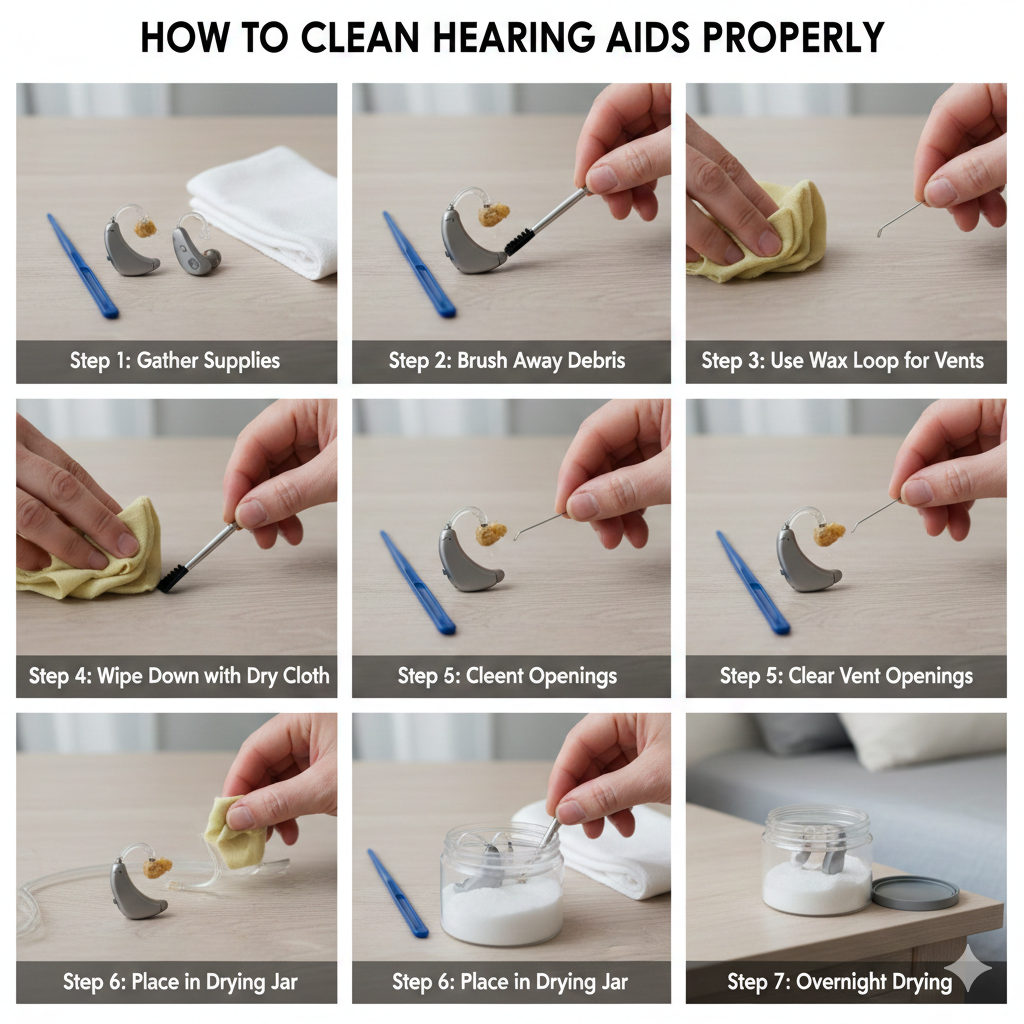 Clean hearing aids properly by wiping them daily with a dry cloth, removing visible earwax, keeping microphones clear, and drying them overnight. Avoid water, alcohol, and household cleaners, which can damage internal electronics.
